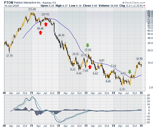 | Figure 1 is a longer-term weekly chart of PTON showing its steady decline from a high of $171.09 in January 2021, to a low of $2.70 in April 2024. Figure 1 displays the price action of the stock against the backdrop of the 50-day moving average and nothing else. Even though we have numerous technical tools at our disposal, it is often best not to clutter the chart for clarity and simplicity. |