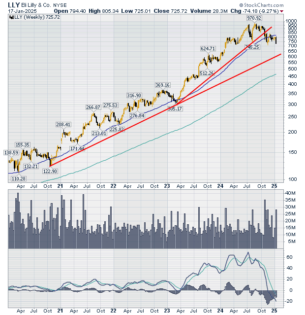 | Figure 1 shows that LLY shares had been on a long-term uptrend over the last four years. Shares rose from $122 in October 2020 up to $970 in August 2024, A whopping 695% increase. Figure 1 shows the uptrend lines marking the remarkable rise of this stock. |