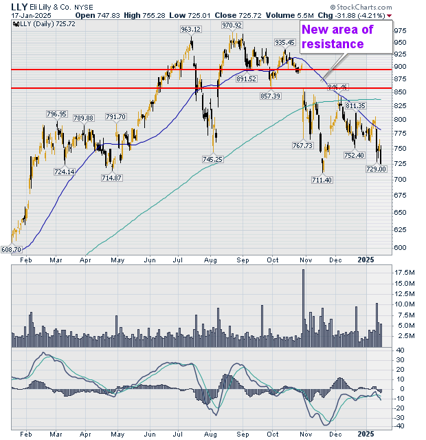 | But $970 proved to be LLY's high and shares began to retreat after the August 22, 2024 highs. The August 22 high was the second peak of a double top price pattern. The first top had been completed in July of that year. |