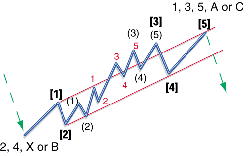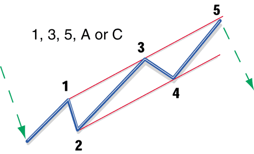 | Part I discussed the basic wave patterns, impulse and corrective. Part II will describe the patterns that must be recognized in order to do a thorough job of Elliott wave (EW) analysis. The following examples by no means include all the patterns you will encounter in your Elliott wave analysis, but represent those that appear most often. You need to know not only to what price levels the market will rise, but also what patterns to expect in your bar (candle) chart. The two main Elliott waves are motive and corrective. The motive wave is a five-wave configuration with waves 1, 3, and 5 in the direction of the trend. In a bull market you will expect each wave to be higher than the preceding one. Think of these as higher highs. In a bear market these waves will be descending; think of them as lower lows. The corrective waves, 2 and 4, will move in the opposite direction to the major trend. The motive wave has only one basic configuration, with several variations. These you will learn fairly quickly. Corrective waves, however, have many configurations, some very complicated. These will take longer to learn, but are necessary for a thorough wave analysis.