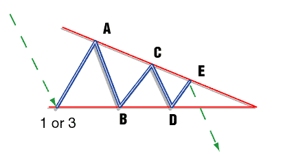 Diagonal Triangle Type 2 (Figure 5): This is also referred to as a leading diagonal as it appears most frequently in waves 1 and A. Again, don't confuse this with a corrective triangle. What distinguishes this pattern from a type 1 is the configuration, which is 5-3-5-3-5. Being a motive wave, the first wave is a 1-2-3-4-5.
