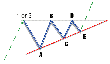 Descending Triangle (Figure 10): The descending triangle has a top that slopes down and a flat bottom. Chartists not using Elliott wave analysis normally expect this triangle to break out to the upside, considering the flat bottom as a support line. However, this is a corrective pattern and must be followed by a W3 or a W5 in the direction of the trend. Figure 10 is a pattern in a bear market. I chose this pattern to show that the breakout is dependent upon the succeeding wave, not the shape of the pattern itself.