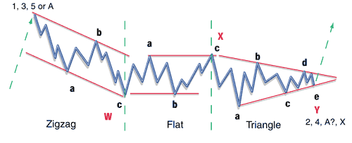CORRECTIVE WAVESCorrective waves appear in three basic patterns: zigzag, flat, and triangle. Within these three patterns are many variations and combinations, which makes this one of the most difficult areas of study. I always have a chart of all the patterns handy when I am analyzing a chart. If you are not dealing with Elliott wave every day, it is not easy to keep everything in your memory. When analyzing corrective waves, be aware of the guideline of alternation, which states that if W2 is a simple configuration, then W4 will probably be a complex one.