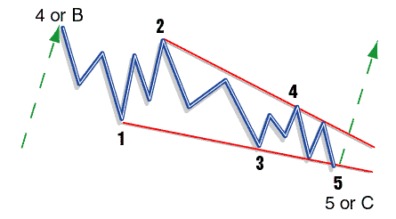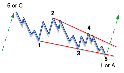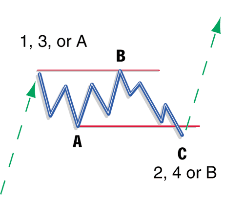 Zigzag (Figure 6): The zigzag pattern is very common and is aptly named. It is easily recognized by B being shorter than A, and C extending beyond A, giving it a zigzag shape (from the technical analysis indicator of the same name). It has a 5-3-5 configuration.