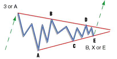 Symmetrical Triangle (Figure 9): The symmetrical triangle is bound by converging lines and may be expanding or contracting. In an expanding triangle (a megaphone shape), W1 will be the shortest and W5 the longest. In a contracting triangle, W1 will be the longest and W5 the shortest. The breakout is in the direction of the trend.